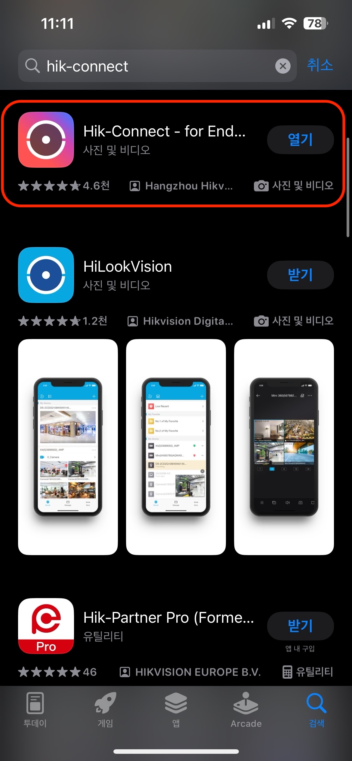 플레이스토어(Android) 또는 앱스토어(iOS)에서 hik-connect검색